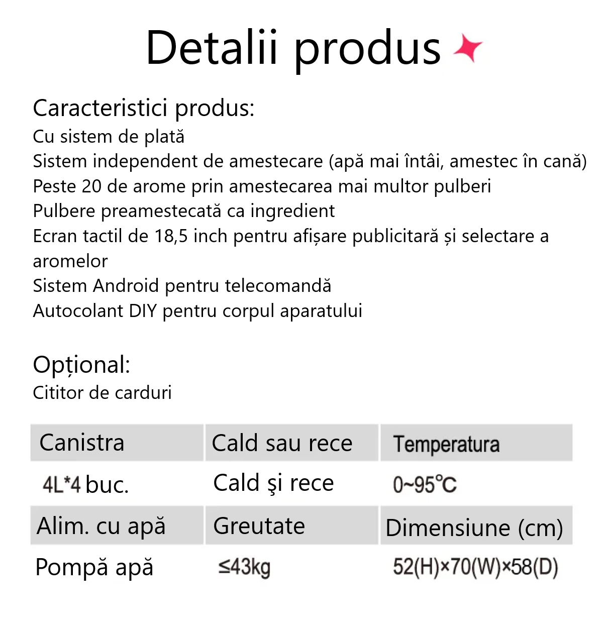 OBSERVATIE: sistemul de plată cu card bancar se va achiziționa separat, contra-cost !