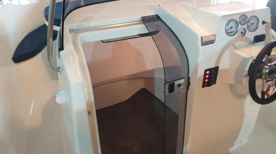 Cabina mică, dar funcțională, dispune de spațiu amplu de depozitare încuiat pentru o toaletă chimică și alte obiecte esențiale.