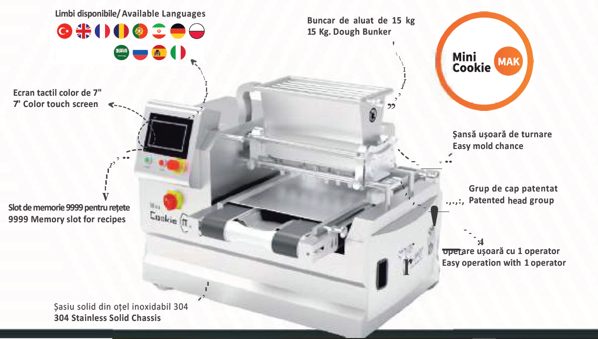 Mini CookieMAK este un asistent esențial pentru afacerile cu spațiu limitat, oferind performanță și durabilitate maxime. Deși ocupă doar 1 metru pătrat de spațiu, are flexibilitatea de a produce sute de produse pentru dumneavoastră.