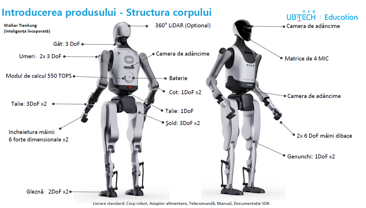 Configurație umanoidă de dimensiuni normale: configurație robot umanoidă cu 20 de grade de libertate, care permite alergarea la viteză mare de 10 km/h și mișcări complexe; capabil de mers înainte, înapoi, întoarcere, stat pe loc, mers rapid, alergare și control complet al corpului (brațe, oase, picioare) cu interfețe deschise. |
